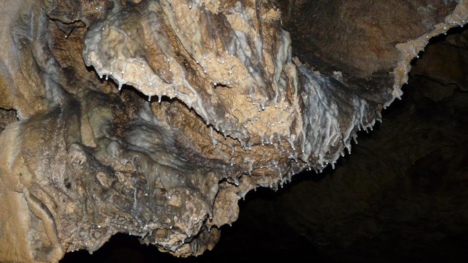 - La grotte est concrétionnèe mais les concrétions sont vieillissantes car ternies, s'y ajoute sans aussi quelques actes de vandalisme ! La grotte est assez profonde et se poursuit par deux petits lacs, le premier se franchit avec de l' eau à hauteur de botte, le second est plus profond et atteint la ceinture. La grotte mesure 850m de longueur et se termine par un siphon et étroiture de boue.