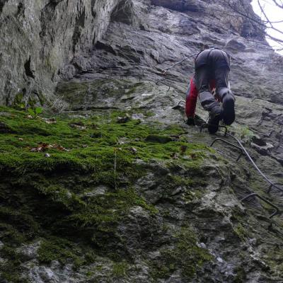 - par une désescalade dans une faille, on arrive au passage des Rastapenados que l'on escalade dans la pénombre sur 15 m tantôt sur un mur, tantôt sur l' autre mur. A sa sortie, passage descendant en forêt le long de la paroi pour arriver au dernier mur de 30 m.