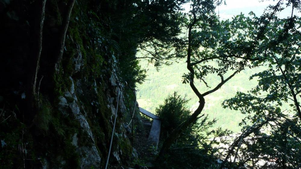 - Ce passage précède les "jardins" et la passerelle peu avant la remontée verticale vers la sortie. Derniers instants de domination de la vallée de Tenay, sa route bruyante et son chemin de fer ...Les compagnons ferratistes m' ont laissé passé et j' ai poursuivi en solitaire jusque la sortie.J 'ai parcouru la via en 1h45.