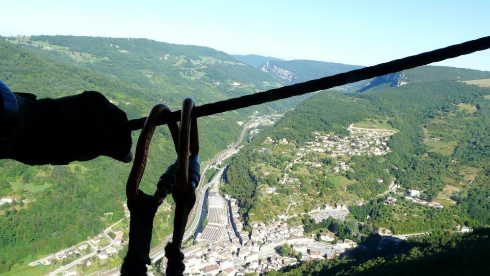 - J' ai toujours grand plaisir à faire cette via ferrata en raison de son parcours aérien et vertigineux au dessus de la vallée de l' Albarine.Cette fois ci, je vais faire la via des grottes et poursuivre par le grand parcours. C' est un itineraire tout en traversée, à l' heure où je commence la via ferrata, je suis sans précédé par des ferratistes, car un véhicule est déjà stationné sur le parking.