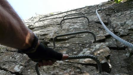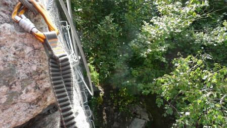 - La via de la cascade est installée en paralèlle à cette dernière, assez écartée (30 à à 50m), ce qui n'empêche pas de recevoir les embruns ! Elle n' est pas impressionnante (comme celle de la cascade de la Pisse) car la pente n'est pas une verticale absolue, on a un peu l'impression de grimper à l'échelle.La première chute en cascade franchie, la via se poursuit en sentier ascendant jusque la seconde chute en cascade.