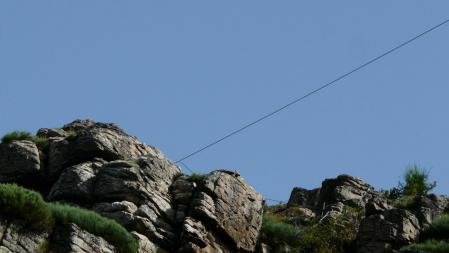 - La tyrolienne est peu impressionnante au dessus d'un talweg. Attention elle est rapide et l' arrivée peut être brutale (arrêt poulie sur noeud de câble ... et donc avec rétro-réaction ! ... et hop ! c'est reparti !).