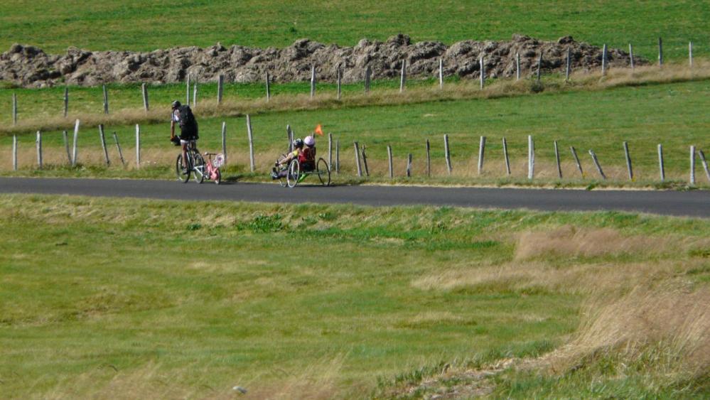 - 15h30 Après avoir préparé le cycliste, je pars direction le col de la Croix Saint Robert au dessus de Mont Dore. Finalement pas de difficulté avec la chaleur, il fait plutôt meilleur à vélo ! Il y a de la brise ... et de face en montant ... ça rafraîchit ! Je ne verrai pas beaucoup de cyclistes dans la montée .. à part un couple dont la femme est sur un vélo couché avec sa fille comme passagère !