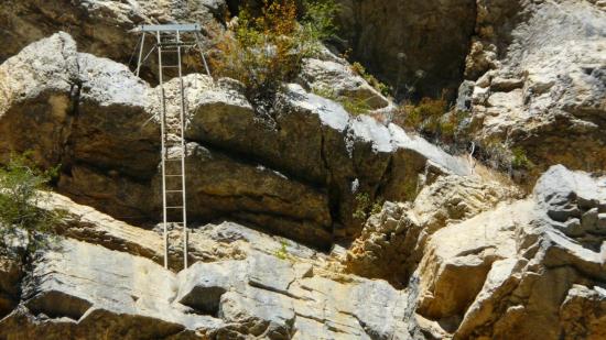 - C'est à cet endroit qu'une pancarte précise que cette via est privée et n' est autorisé qu'avec l' accompagnement des guides locaux.Je décide donc de ne pas aller plus loin, satisfait d' avoir enfin compris l' itinéraire de cette via ferrata "fantôme", passage sous la cascade compris. Peut être la ferai-je prochainement accompagné par un des guides locaux ... pour définitivement clore ma curiosité ! La via ne semble pas proposer de réelles difficultés.