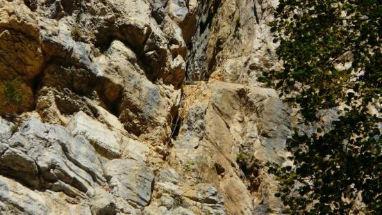 - je décide alors d' aller rechercher du côté gauche de la falaise. Le sentier remonte à flanc de rocher, puis se rétrécit jusque une étroiture ascendante mi faille mi diaclase, dans laquelle la sente se pour suit sans doute jusqu' au plateau ... Toujours pas de grotte !