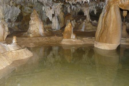 - Je pénètre dans la grotte par un passage bas, et rapidement le plafond se relève. La grotte est concrétionnèe mais les concrétions sont vieillissantes car ternies, s'y ajoute sans aussi quelques actes de vandalisme ! La grotte est assez profonde et se poursuit par deux petits lacs, le premier se franchit avec de l' eau à hauteur de botte, le second est plus profond et atteint la ceinture. La grotte mesure 850m de longueur et se termine par un siphon et etroiture de boue.
