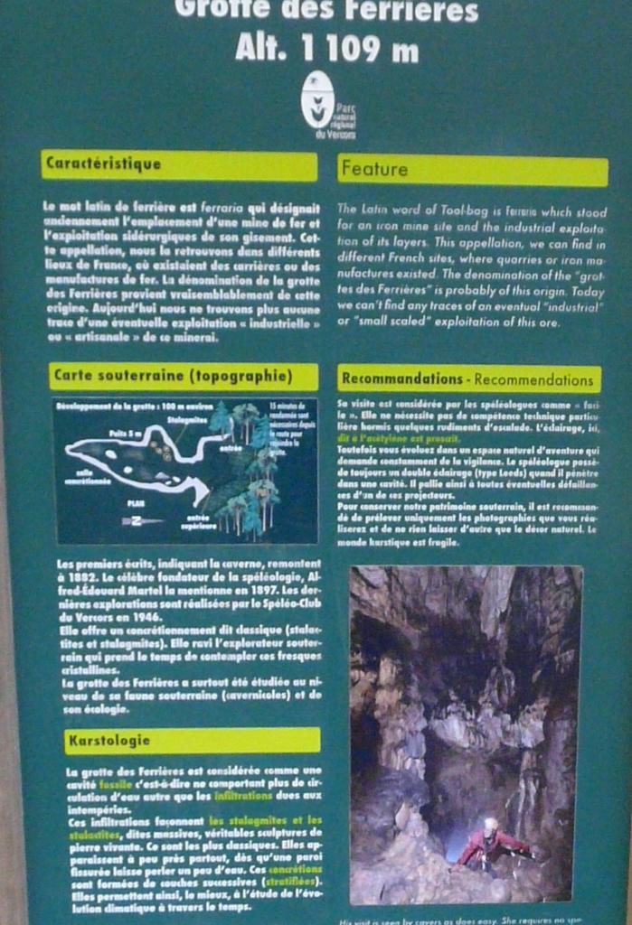 - 9h00 Je suis à la grotte des ferrières, un panneau d' information indique le grotte, petit parking prés du panneau et en face de l' autre côté de la route. Je m' équipe et je pars faire la grotte.