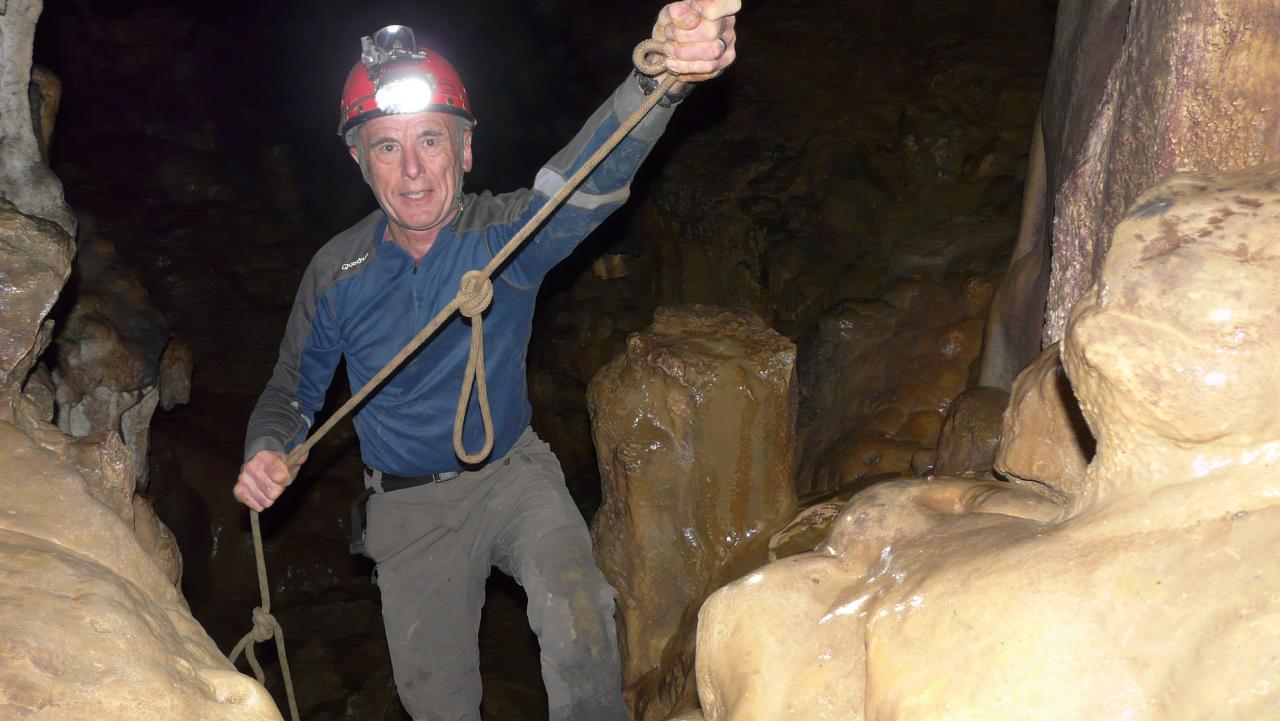 - J 'ai été arrête par une cascade pétrifiée qui descend sur 5 mètres environ, où une corde statique est nécessaire (descendeur, remontée aux freins/pédale).(spits d' amarrage en place). Je n' ai pas hélàs le matériel adéquate, car le réseau se poursuit au delà et je n' ai pas trouvé de passage court-circuitant la verticale ! Je reviendrai faire la totale prochainement !