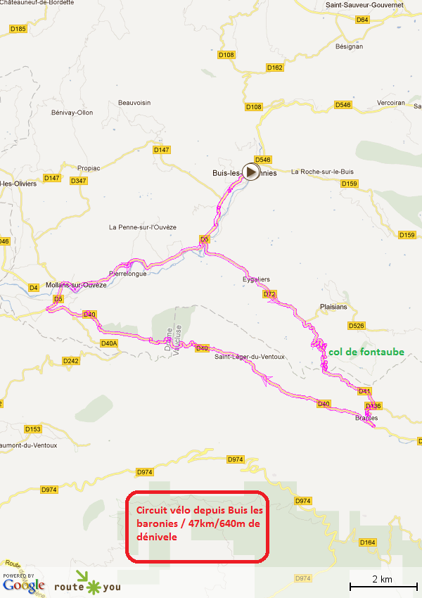 - circuit vélo Buis les baronies/Eygalières par la D72/col de Fontaube/Brantes/St léger de Ventoux par la D40/Mollans sur Ouvèze/Pierrelongue/Buis les Baronies par la D5