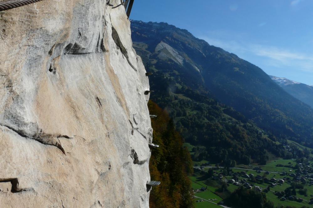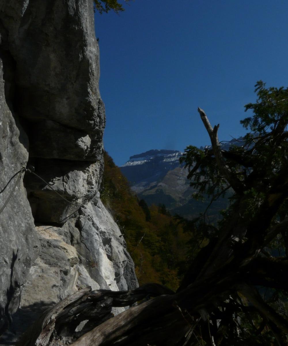 - Après le panneau de départ,on suit la paroi sur un sentier câblé montant (vire de l' ours), jusque la "dalle des paresseux", haute paroi de 40m à monter et qui rejoint la vire du Raffour (à faire au retour de la via). Poursuite sur la droite par un traversée aérienne qui conduit à un premier échappatoire. Descendre pour continuer par une désescalade impressionnante dans un angle,menant à la passerelle de l' Ouizes longue de 15m, très remuante ! la via se poursuit par une traversée très athlétique suivie d'une autre traversée qui mène à l' échelle "la courte échelle" bien "gazeuze"(8m) ! Vient ensuite une traversée ascendante sur la droite, légère descente qui mène à la traversée de l' Arly. On passe ensuite un petit surplomb qui se termine par une dalle court et qui précède une dernière traversée avec un ressaut vertical en sortie de via.