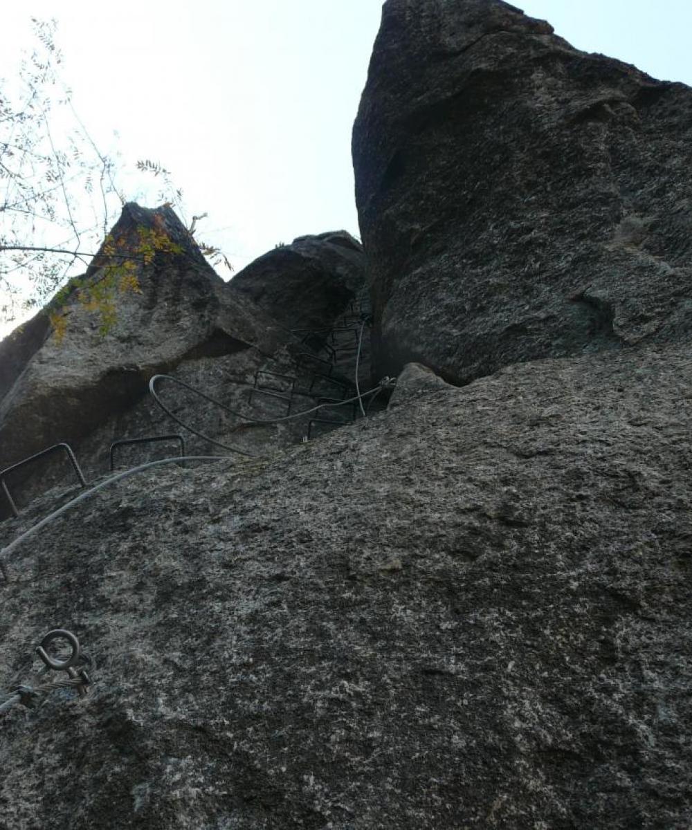 - la parcours comporte une petite passerelle en rondins. le rocher est bon et par endroit la sensation de vide est réelle.On arrive sur un piton rocheux que l' on redescend Sur quelques mètres pour rejoindre la sortie.