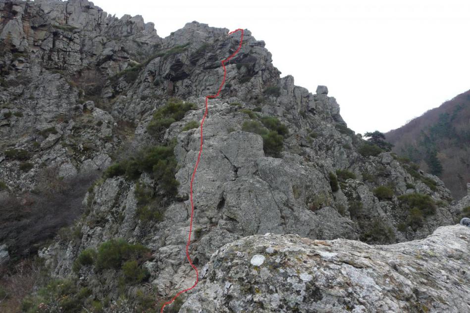- escalade d'un grand mur de 15m (le pilier) et longue traversée (vire des chasseurs) jusque la passerelle. Celle ci mène à la flèche, un grand rocher de 25 mètres suivi d'un mur de 10m environ.
